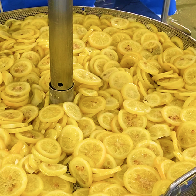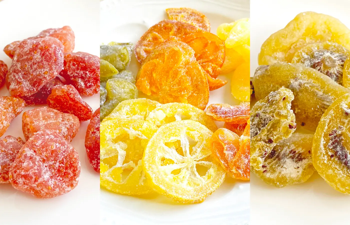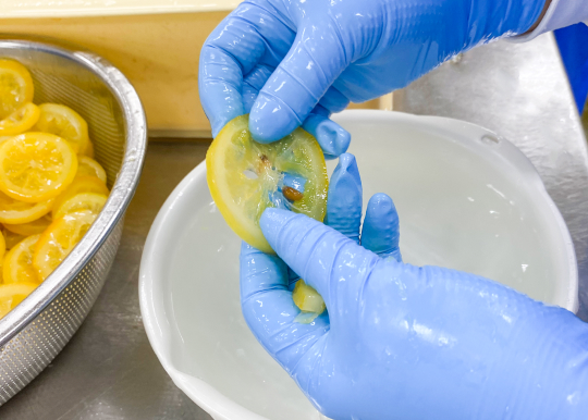 南信州菓子工房で作っているドライフルーツは、シロップ漬けしたものを乾燥しているので、柔らかい食感と素材の味を生かしながらも凝縮した濃い味が特徴です。 人気商品のレモンや、オレンジや八朔などの種がある果物は、釜でシロップ漬けを終えた後に、果肉を崩さないように一つひとつ人の手で丁寧に取り除いています。 他にも果物のカットや包装・検品など、お客様のご要望に細かい部分までお応えできるように「手作業」にこだわった商品づくりを行っています。