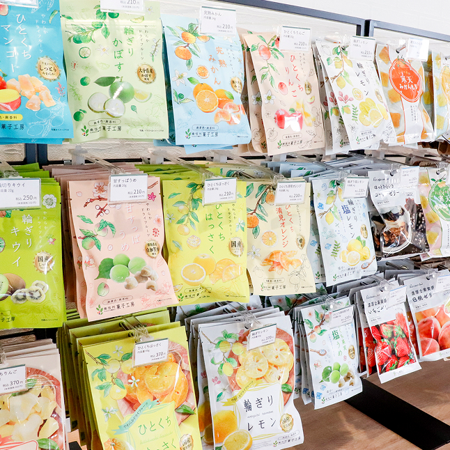 ドライフルーツの新しい食べ方を提案する”開発ラボ”も兼ねたお店。 ドライフルーツを使用した焼き菓子やパン、フルーツを使用した彩り豊かなケーキなど、どれを買うか迷ってしまいそうなほど、様々な商品が並びます。 南信州菓子工房のドライフルーツや昔ながらの手づくり飴も販売し、地元のお客様から観光客まで、年齢年代問わず楽しめます。